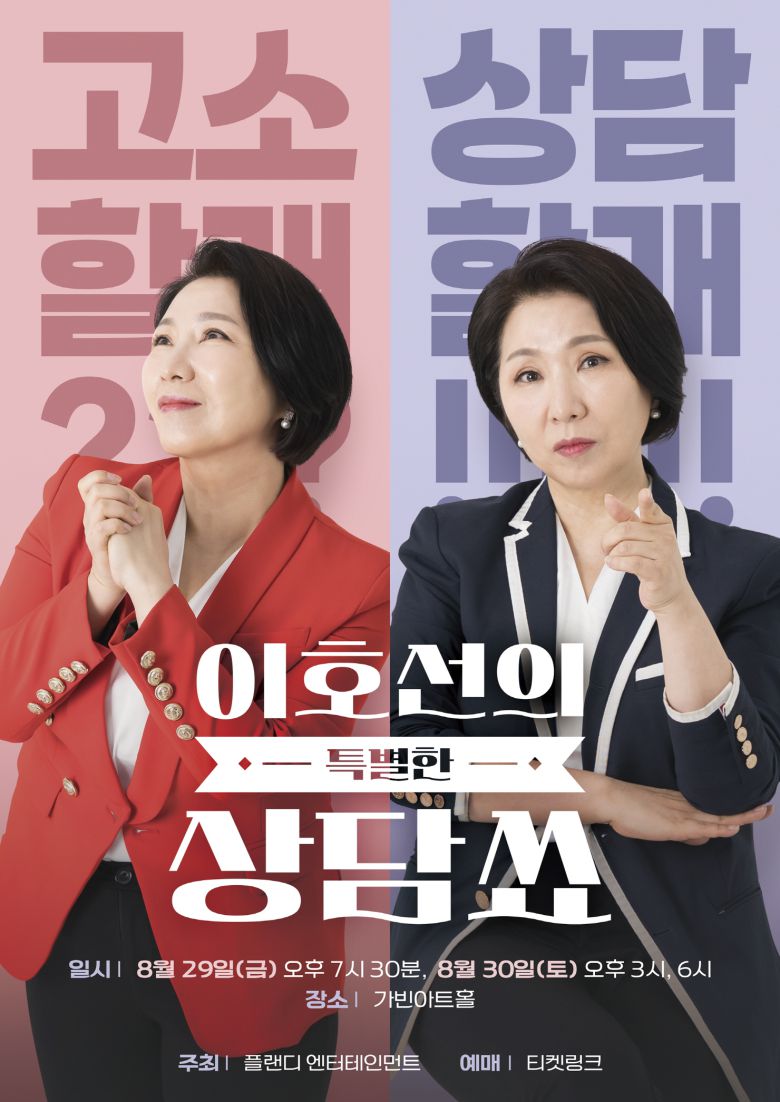 한편, 복잡한 인간관계 속에서 어려움을 겪는 이들에게 실질적인 도움과 마음의 위안을 전할 '이호선의 특별한 상담쑈'는 티켓링크를 통해 예매할 수 있으며, 현장 상담을 원하는 관객은 티켓 예매 후 사전 상담 검사 링크(https://forms.gle/tvdSvVs6MBUtcGj2A)를 통해 신청할 수 있다.