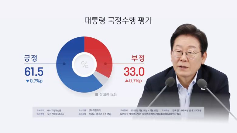 리얼미터가 에너지경제신문 의뢰로 지난 21일부터 닷새간 전국 18세 이상 유권자 2,508명을 대상으로 조사한 결과, 이 대통령의 국정수행에 대한 긍정 평가가 전주보다 0.7%p 하락한 61.5%로 나타났습니다.