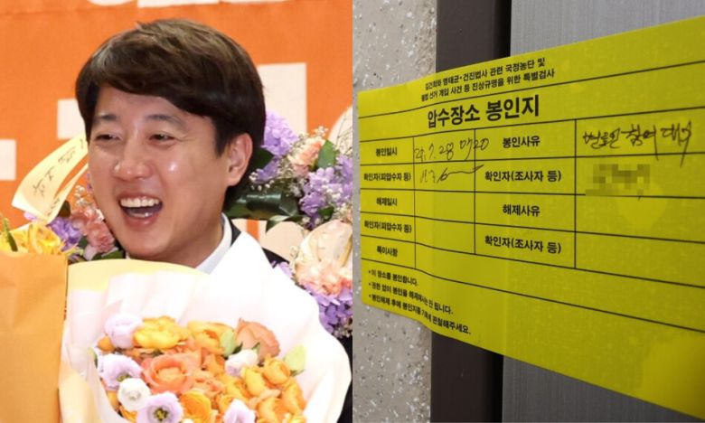 (왼쪽) 27일 국회 의원회관 대회의실에서 열린 개혁신당 2차 정당대회에서 당대표로 확정된 이준석 의원이 지지자들의 꽃다발을 받으며 웃고 있다. (오른쪽) 김건희 여사 관련 의혹들을 수사하는 민중기 특검팀이 이준석 개혁신당 대표에 대한 압수수색에 나선 28일 서울 노원구 이 대표 자택 앞에 ‘압수장소 봉인지\'가 붙어 있다. 윤운식 선임기자 yws@hani.co.kr, 연합뉴스