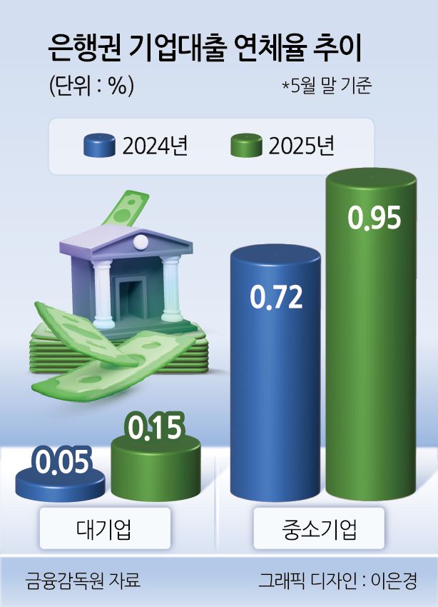 실제 금융감독원에 따르면 지난 5월 말 기준 기업대출 연체율은 0.77%로 지난해 5월(0.58%)보다 0.19%포인트 올랐다. 전월(0.68%)과 비교해도 0.09%포인트 상승했다. 특히, 중소기업대출 연체율은 0.95%로 대기업대출 연체율(0.15%)보다 6배 넘게 높았다. 중소기업대출 중에서도 중소법인 연체율이 1.03%로 개인사업자대출 연체율(0.82%)보다 높았다.