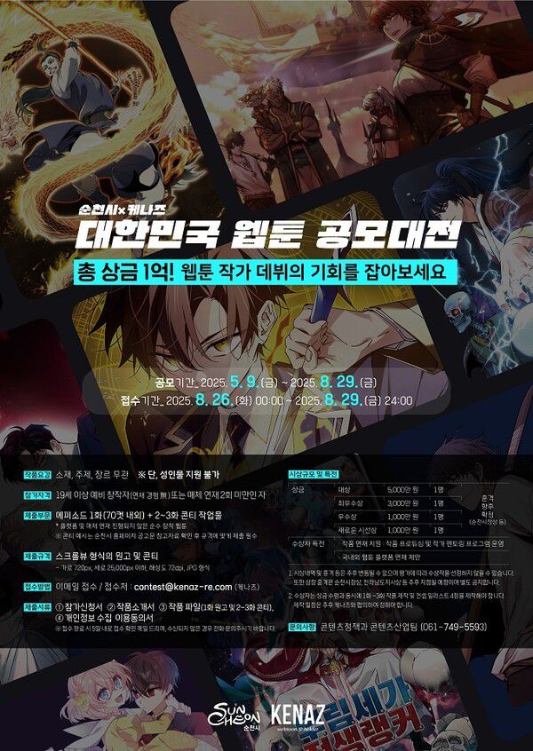 [양준석 기자] 전남 순천시와 글로벌 웹툰 에이전시 케나즈(KENAZ)가 공동 주최하는 '2025 대한민국 웹툰 공모대전'이 오는 8월 작품 접수를 앞두고 본격적인 행보에 나선다.