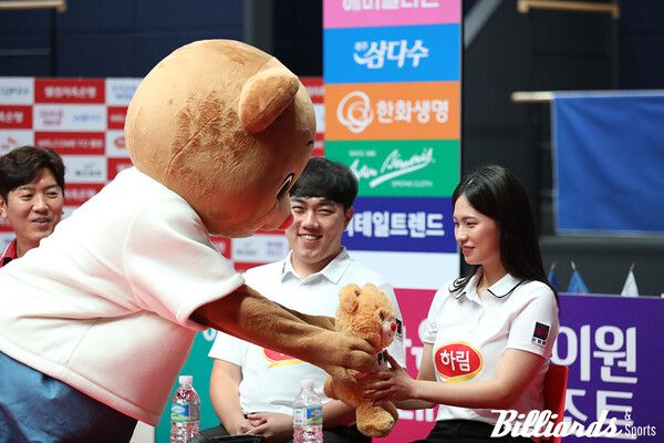 프로당구 피비에이의 마스코트인 ‘빌리 베어’가 21일 팀리그 개막 미디어데이에서 하림의 박정현에게 선물을 주고 있다. 빌리어즈앤스포츠 제공