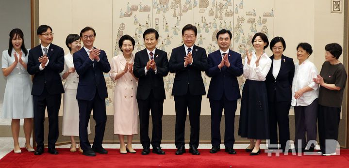 [서울=뉴시스] 최동준 기자 = 이재명 대통령이 28일 서울 용산 대통령실 청사에서 신임 국무위원 및 국세청장에게 임명장을 수여한 뒤 참석자들과 기념촬영을 하고 있다.이 대통령은 안규백 국방부 장관, 정동영 통일부 장관, 전재수 해양수산부 장관, 한성숙 중소벤처기업부 장관, 임광현 국세청장에게 임명장을 수여했다. (대통령실통신사진기자단) 2025.07.28. photocdj@newsis.com |