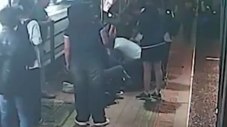 학생들이 모여 있는 중간에 한 시민이 쓰러져 있습니다.