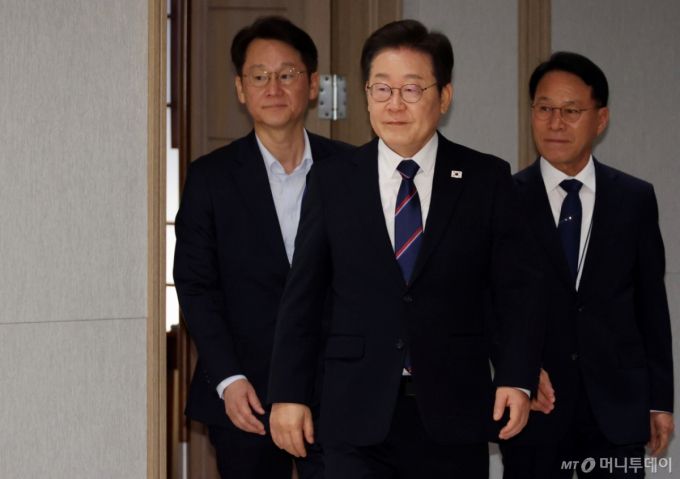 [서울=뉴시스] 최동준 기자 = 이재명 대통령이 28일 서울 용산 대통령실 청사에서 열린 신임 국무위원 및 국세청장 임명장 수여식에 입장하고 있다. (대통령실통신사진기자단) 2025.07.28. photocdj@newsis.com /사진= |