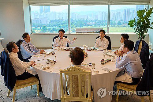 (서울=연합뉴스) 이재명 대통령이 28일 용산 대통령실에서 김민석 국무총리와 오찬을 하며 주례 보고를 받고 있다. 2025.7.28 [대통령실 제공. 재판매 및 DB 금지]