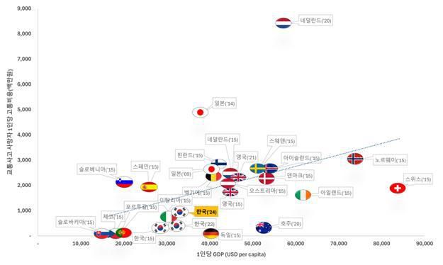 1인당 GDP(국내총생산)와 교통사고 사망자로 인한 고통비용 간 관계. [자료=한국교통연구원]