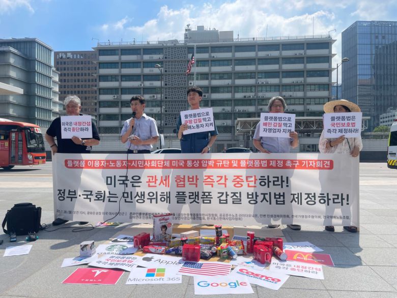 한·미 간 막판 관세 협상이 진행 중인 가운데 소상공인·노동·시민사회단체가 28일 미국 하원이 최근 한국 공정거래위원회에 보낸 온라인 플랫폼법 관련 항의 서한을 ‘내정 간섭’이라며 반발했다. 이들은 공정거래위원회의 온플법 제정을 촉구했다.