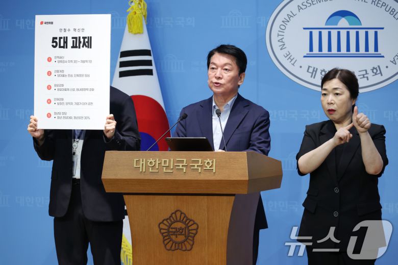 국민의힘 당대표 출마를 선언한 안철수 의원이 28일 오전 서울 여의도 국회 소통관에서 국민의힘 혁신안 관련 기자회견을 하고 있다. 2025.7.28/뉴스1 ⓒ News1 이광호 기자 |