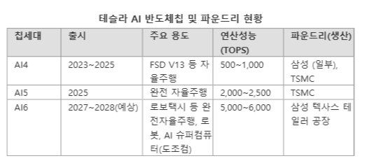 테슬라는 완전자율주행(FSD) 기능을 위해 AI4·AI5·AI6 등 자율주행용 인공지능(AI) 칩을 개발해 차량에 탑재하고 있다. AI4는 현재 삼성 파운드리 평택공장에서 양산되고 있고, 이중 가장 최신형 칩인 AI6는 내년 가동 예정인 미국 텍사스주 테일러 팹(공장)에서 2나노 첨단 공정을 활용해 만들어질 예정이다.