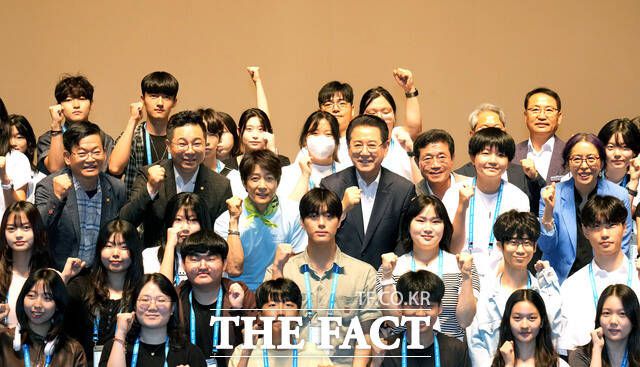 김영록 전남도지사가 28일 오후 광양 문화예술회관에서 열린 ‘제14회 최수종과 함께하는 전남연기캠프 입소식’에 참석, 청소년들과 기념 촬영을 하고 있다./전남도 |