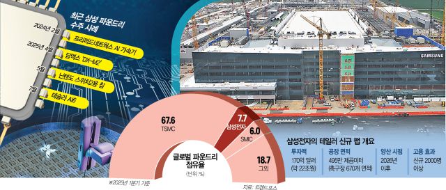 이번 수주는 업계 1위 대만 TSMC와의 격차를 줄이는 데도 기여할 것으로 전망된다. AI 반도체가 반도체 업계 지형을 흔들면서 삼성전자와 TSMC의 격차는 점점 벌어졌다. 시장조사 기관 트렌드포스에 따르면 올해 1분기 파운드리 점유율은 TSMC가 67.6%인 반면 삼성전자는 7.7%로 60%포인트 가까이 벌어졌다. 반면 중국 SMIC는 6.0%를 기록하면서 삼성이 2위 자리를 빼앗길 수 있다는 분석도 나올 정도다.