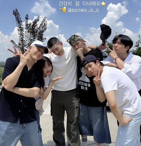 아스트로 멤버들과 그룹 위키미키 출신 최유정도 함께했다. 특히 윤산하는 차은우의 어린시절 사진과 '군대 보낼 때 입는 옷'이라는 문구가 쓰인 티셔츠까지 착용하고 차은우를 배웅해 이목을 집중시켰다.