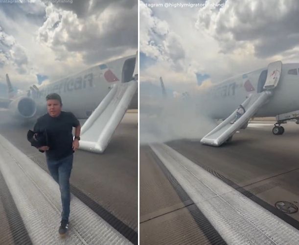 현지시간으로 26일 미국 덴버에서 마이애미로 향할 예정이던 항공편 탑승객들이 이륙 전 랜딩기어 고장으로 멈춰 선 비행기에서 탈출하고 있다. 엑스 캡처 |
