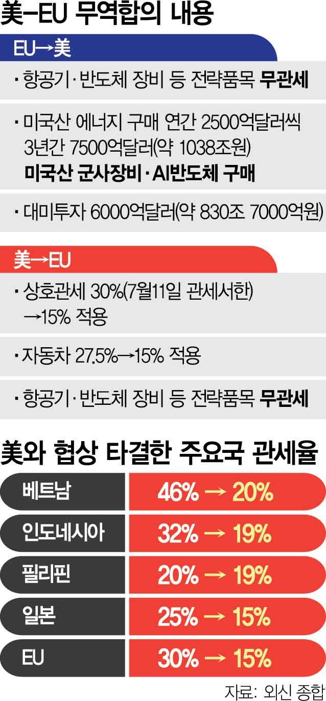 27일(현지 시간) 미·EU 무역 협상 타결로 EU에 다음 달 1일부로 예고된 상호관세는 30%에서 15%로 낮아지게 됐고, 자동차에 적용된 관세도 기존 27.5%(품목관세 25%+기존 2.5%)에서 15%로 내려갔다. EU는 미국에 6000억 달러를 투자하기로 한 데 이어 3년간 7500억 달러어치의 에너지도 수입하기로 했다. 이에 더해 미국산 군사 장비와 인공지능(AI) 반도체를 구매하기로 약정한 만큼 1조 3500억 달러+알파(α)의 돈을 미국에 쏟아붓게 됐다. 더 나아가 트럼프 대통령은 “EU가 미국에 무역을 개방하고 관세율을 0%로 낮추기로 했다”고 했고 우르줄라 폰데어라이엔 EU 집행위원장 역시 “유럽 시장은 기본적으로 개방됐다”고 말해 원칙적으로 미국에 시장을 열겠다는 뜻을 밝혔다.