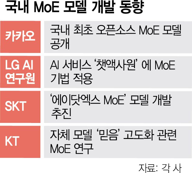KT도 이달 초 LLM ‘믿음 2.0’을 공개하며 “향후 MoE 구조 같은 대규모 모델 아키텍처 확장과 학습 효율성 연구를 지속할 계획”이라며 MoE 모델 개발 방침을 밝혔다. 카카오는 24일 국내 최초 오픈소스(개방형) MoE 모델 ‘카나나-1.5-15.7B-A3B’를 공개하며 주도권 확보에 나섰다. 이 모델이 기존 모델보다 2~3배 적은 파라미터(자원)만으로 더 높은 추론 연산을 할 수 있다는 설명이다. LG AI연구원은 앞서 AI 서비스 ‘챗엑사원’에 MoE 기법을 적용했다. ‘엑사원’ 모델 자체는 MoE가 아니지만 이 모델 여러 개를 각각의 전문가로 만들어 이용자가 MoE처럼 쓸 수 있게 구현한 것이다.