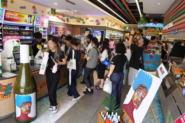이날 가장 많은 대기 인파를 기록한 챌린지스토어점은 판매 15분 만에 준비했던 물량이 모두 팔렸다. 출시 기념 팝업스토어(임시매장) 행사가 열리고 있는 이 매장에선 하정우 작품이 들어간 투명 부채와 와인 쇼핑백, 코스터 등을 제공하기도 했다.