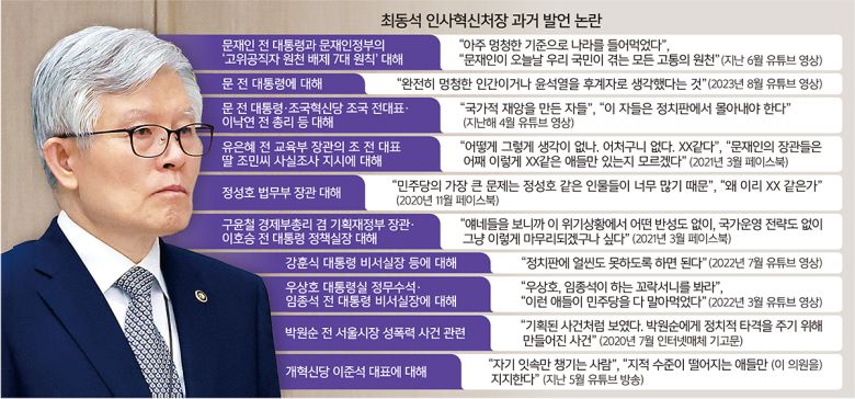 야권에서는 최 처장을 ‘초대형 막말 유튜버’, ‘인사 참사 끝판왕’ 등으로 칭하며 사퇴 압박 수위를 끌어올렸다.