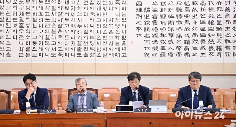 28일 오후 서울 여의도 국회 법제사법위원회 법안심사제1소위원회에서 '검찰개혁 4법'과 관련한 공청회를 진행하고 있다.왼쪽부터 모성준 사법연수원 교수, 서보학 경희대 법학전문대 교수, 양홍석 변호사, 이광철 변호사. [사진=곽영래 기자] |