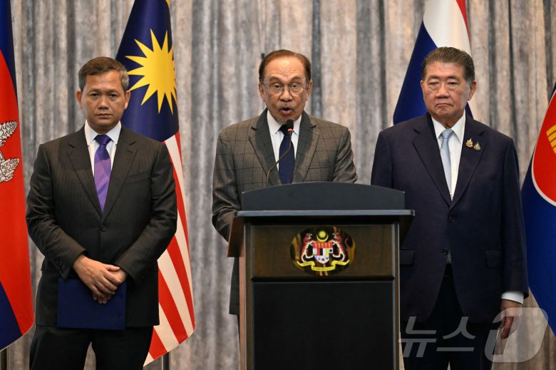 28일(현지시간) 말레이시아 푸트라자야에서 (왼쪽부터) 훈 마네트 캄보디아 총리, 안와르 이브라힘 말레이시아 총리, 품탐 웨차야차이 태국 총리가 태국과 캄보디아의 휴전 합의를 발표하고 있다. 2025.07.28 ⓒ 로이터=뉴스1 ⓒ News1 김지완 기자