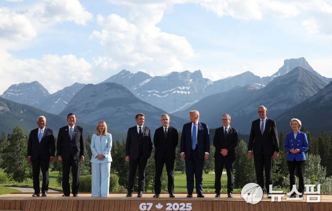 주요 7개국(G7) 정상회의에 참석한 각국 정상들이 기념촬영을 하고 있다. 왼쪽부터 안토니우 코스타 EU 정상회의 상임의장, 이시바 시게루 일본 총리, 조르자 멜로니 이탈리아 총리, 에마뉘엘 마크롱 프랑스 대통령, 마크 카니 캐나다 총리, 도널드 트럼프 미국 대통령, 키어 스타머 영국 총리, 프리드리히 메르츠 독일 총리, 우르줄라 폰 데어 라이엔 EU 집행위원장 [사진=로이터 뉴스핌] |