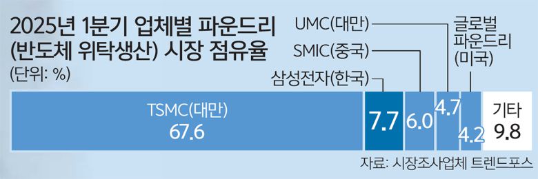 이 회장이 파운드리 분사설을 일축할 당시 삼성 파운드리는 세계 최대 파운드리 업체인 대만 TSMC와의 격차가 점점 더 벌어지고 있었다. 대만 시장조사업체 트렌드포스에 따르면 지난해 2분기 TSMC의 시장 점유율은 62.3%로 삼성(11.5%)보다 50.8%포인트가 높았다. 올해 1분기 점유율은 TSMC가 67.6%, 삼성전자가 7.7%로 격차가 무려 59.9%포인트까지 확대된 상황이다.