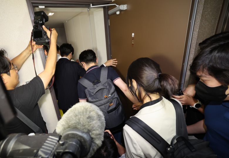 이준석 자택 들어가는 특검팀 김건희 여사 관련 의혹들을 수사하는 민중기 특별검사팀 관계자들이 28일 이준석 개혁신당 대표의 서울 노원구 자택을 압수수색하기 위해 들어가고 있다. 연합뉴스 |