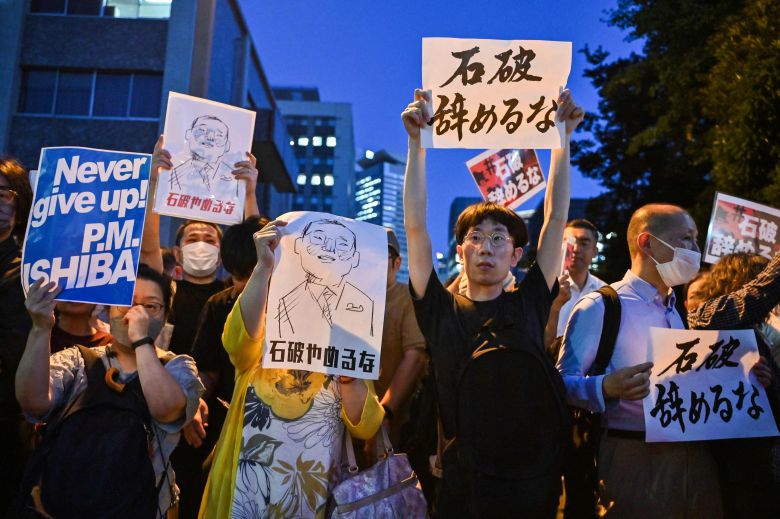 25일 도쿄에서 열린 이시바 시게루 일본 총리 지지 시위에 "이시마 그만두지마" "이시바 물러나지마" 등 손 피켓을 들고 모인 군중의 모습. /AFP 연합뉴스 |