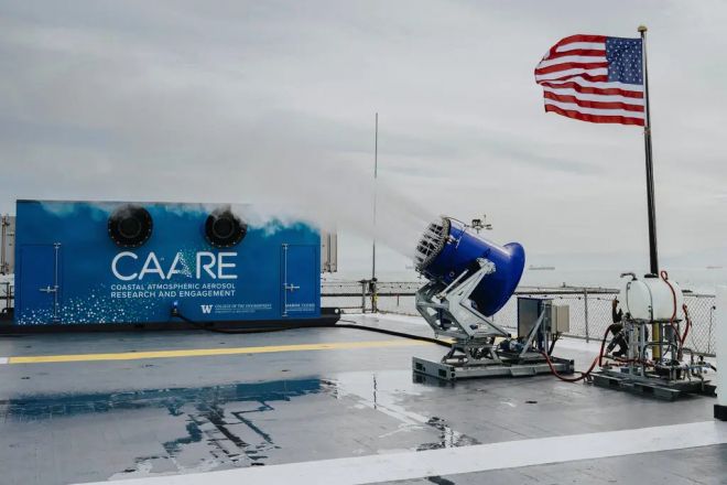 이 연구는 미국 워싱턴대학이 주도하고, 민간 연구단체 ‘실버라이닝’과 과학 비영리 기관 SRI 인터내셔널이 참여하는 ‘해양 구름 밝히기 프로그램(MCB·Marine Cloud Brightening)’의 일환이다. 연구팀은 지난해 4월 퇴역 항공모함 ‘USS 호넷’ 위에서 바닷물 입자를 뿌리는 장비를 실험했지만, 사전 고지 없이 진행한 사실이 알려지면서 캘리포니아 알라메다 시의회의 제지로 실험은 20분 만에 중단됐다.