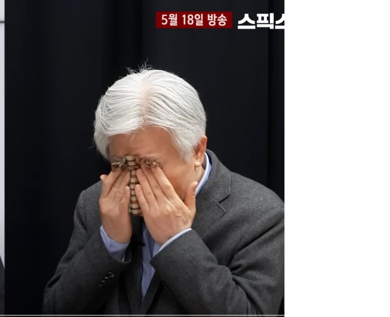 신임 최동석 인사혁신처장이 지난 5월 한 유튜브에 출연해 이재명 대통령의 유세 장면을 보더니 손수건으로 눈물을 닦아 내고 있다. |