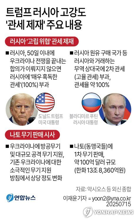 앞서 트럼프 대통령은 지난 14일 백악관에서 마르크 뤼터 북대서양조약기구(NATO·나토) 사무총장을 만난 자리에서 50일 안에 우크라이나 전쟁 종전 합의를 하지 않을 경우 러시아에 혹독한 관세를 부과하고, 러시아와 교역하는 국가에도 100% 정도의 '2차 관세'를 부과할 것이라고 밝힌 바 있다.