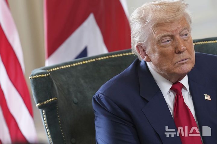 [턴베리=AP/뉴시스]도널드 트럼프 미국 대통령이 28일(현지 시간) 스코틀랜드 턴베리에 있는 자신의 골프 클럽에서 키어 스타머 영국총리와 회담하기 앞서 취재진 질문을 듣고 있다. 2025.07.28. |