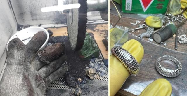 주얼리 노동자들이 보내준 작업 사진은 한눈에 봐도 위태롭다. 귀금속 광택을 내는 톱니모양 광택기 작업을 할 때면 면장갑이 금세 찢어지고 까만 금속가루가 온몸을 덮는다. 귀금속을 늘리고 자르는 가공 작업은 노동자의 손에 귀금속을 끼어 넣고 공구를 이용해 작업한다. 이 과정에서 손가락을 다치거나 잘리는 사고를 당한 노동자가 많다.