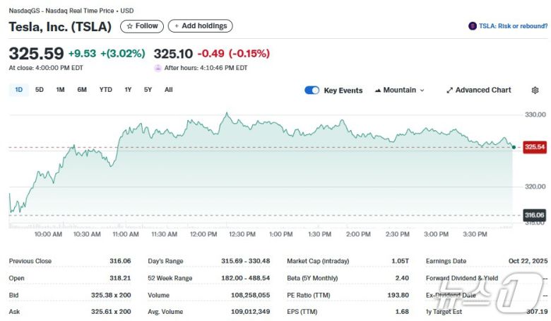 28일(현지 시간) 뉴욕증시에서 테슬라는 3.02% 급등한 325.59달러를 기록했다. 이로써 시총도 1조500억달러로 불어, 다시 시총 1조달러를 회복했다.