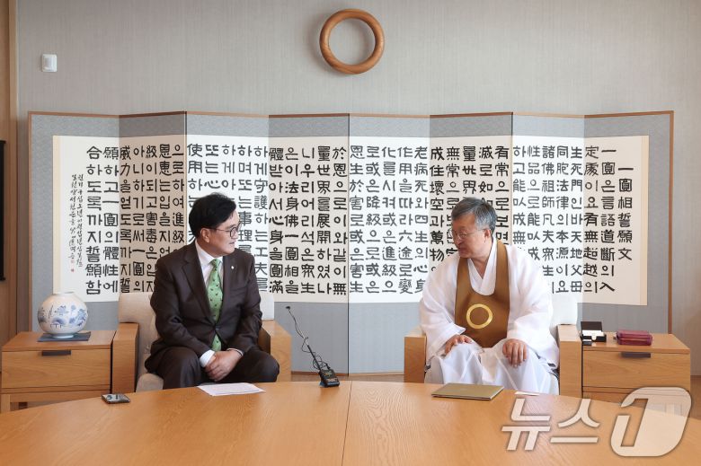 우원식 국회의장이 지난해 8월 28일 오전 서울 동작구 원불교 소태산기념관을 찾아 나상호 교정원장을 예방하고 있다. (국회의장실 제공) 2024.8.28/뉴스1