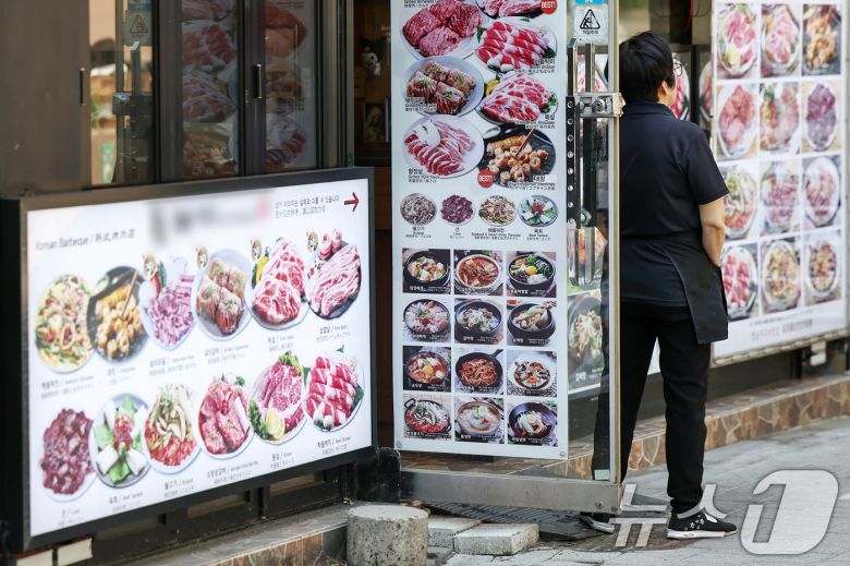서울 중구 명동의 한 식당에서 한 자영업자가 문 밖에 서서 손님을 기다리고 있다. 2025.6.12/뉴스1 ⓒ News1 민경석 기자