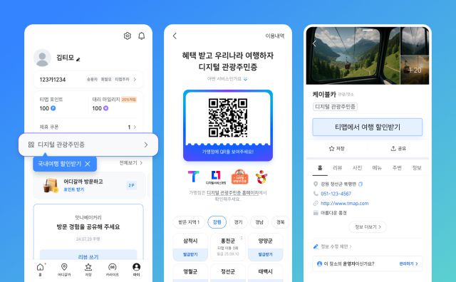 이번 서비스는 행정안전부의 ‘디지털서비스개방’ 정책에 따라 기존 공공 애플리케이션(앱)·웹에서만 가능했던 발급 과정을 민간 앱으로 확대한 것이다. 사용자는 티맵에서 디지털 관광주민증을 간편하게 이용할 수 있다. 이용자는 티맵 내 ‘마이’ 탭 중 ‘디지털 관광주민증’ 메뉴 또는 장소 상세화면을 통해 발급 및 사용이 가능하다. 티맵 사용자라면 QR코드가 즉시 발급되며, 해당 지역에 거주하지 않아도 가맹점을 방문해 제시하면 혜택을 받을 수 있다. 대표적으로 강원도 정선의 케이블카 요금 30% 할인, 충북 단양의 패러글라이딩 체험 프로그램 이용료 1~2만 원 할인, 전남 구례의 수목원 입장권 50% 할인 등 전국 가맹점에서 다양한 혜택을 누릴 수 있다.