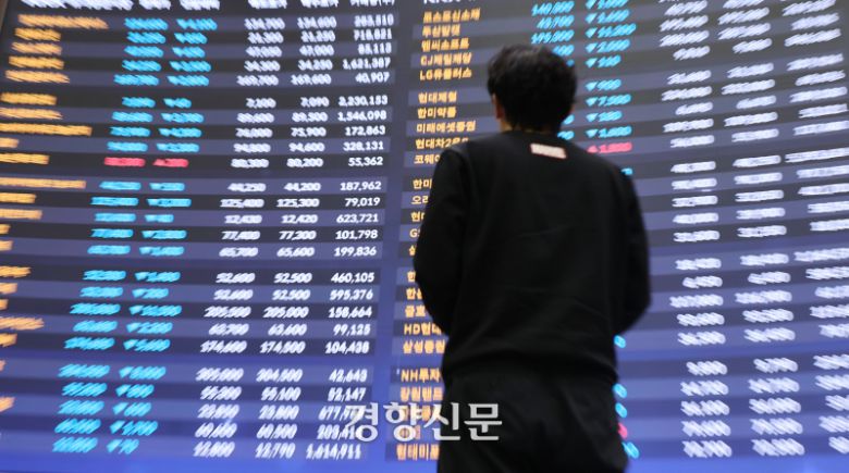 서울 여의도 한국거래소 홍보관에서 한 시민이 전광판 앞을 지나는 모습. [사진 연합뉴스]