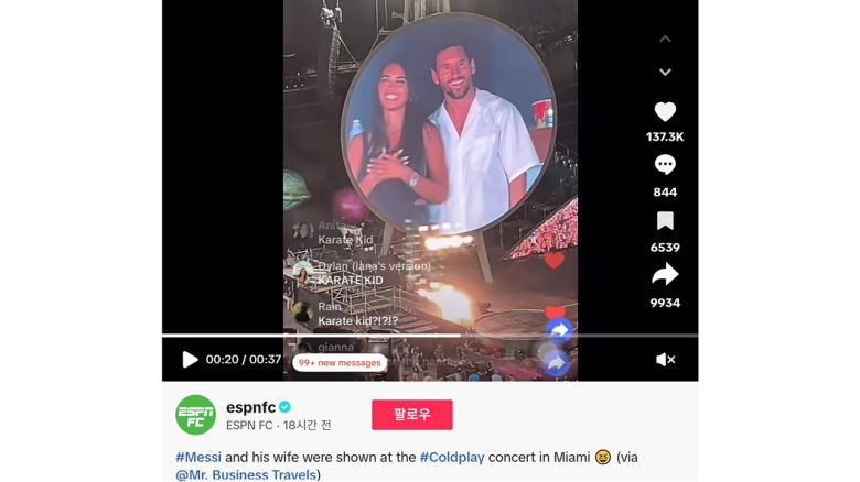 최근 화제가 된 록밴드 콜드플레이 콘서트장의 커플 촬영 카메라 '키스캠'(Kiss Cam)에 세계적인 축구 스타 리오넬 메시(38) 부부가 포착돼 팬들의 관심을 끌었습니다.