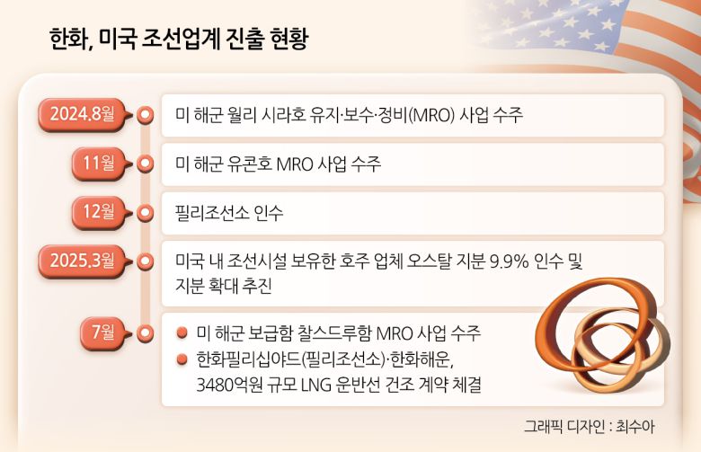 한화는 또한 지난해부터 미 해군 군함 3척에 대한 MRO 사업을 연달아 수주했으며, 다른 해군 프로젝트 입찰도 진행 중이다. 미국 해군 함정 MRO 사업은 연간 20조원 시장으로 평가 받는다. 이달 22일에는 LNG 운반선 1척에 대한 건조 계약을 체결하기도 했다. 이는 3480억원 규모로 1970년대 후반 이후 약 50년 만에 미국 조선소에 발주된 수출형 LNG 운반선이다.