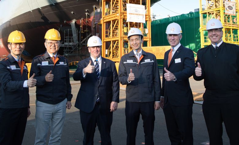 지난 4월 미국 해군성 존 필린 장관(왼쪽에서 세 번째)이 한화오션 거제사업장에 방문, 한화그룹 김동관 부회장(왼쪽에서 네 번째) 등 관계자들과 정비 중인 ‘유콘’함을 배경으로 기념촬영을 하고 있다. [한화오션 제공]