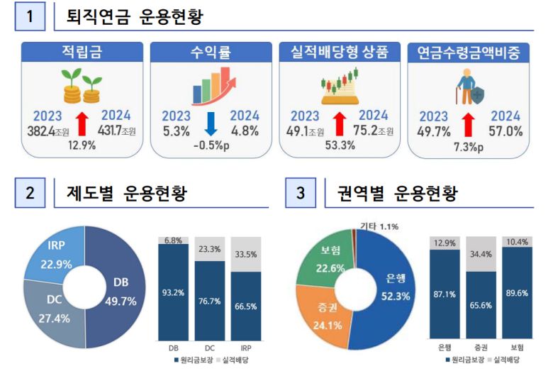 고용노동부·금융감독원이 발표한 '2024 퇴직연금 투자 백서'에 따르면 지난해 말 퇴직연금 적립금은 431조7000억원으로 전년 대비 12.9% 증가해 3년 연속 두 자릿수 성장세를 이어갔다. 아울러 주택연금 보증공급액은 올 4월 기준 142조9839억원으로 140조원 선을 돌파했다.