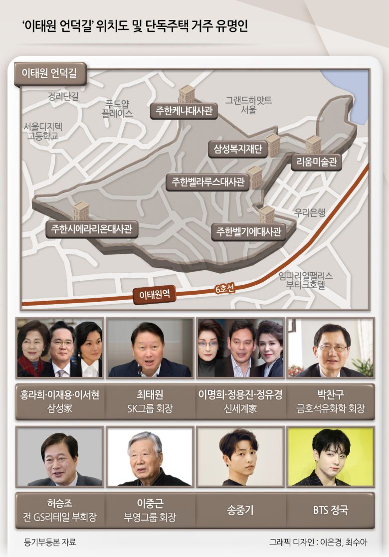 사생활이 누구보다 중요한 세계적 케이팝 스타 BTS(방탄소년단)의 멤버 정국도 이태원 언덕길 내 삼성가족타운 인근 단독주택을 매수해 살고 있다. 2020년 11월 76억3000만원에 단독주택을 매수한 정국은 기존 건물을 철거하고 새 단독주택을 신축해 지난해 말부터 입주해 생활하고 있다.