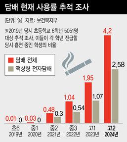 질병관리청이 29일 발표한 ‘6차 청소년 건강패널조사’를 보면, 고1에서 고2로 진급할 때 흡연 학생이 급증했다. 중3 때 흡연율(담배제품 현재 사용률)이 1%를 웃돌고 고1 때 1.95%까지 뛰었다가 고2가 되면 이 비율이 4.20%까지 급상승한 것이다. 이 결과는 2019년 당시 전국 초등학교 6학년 약 5천명을 대상으로 학년이 올라갈 때마다 흡연 여부 등을 면접조사 방식으로 따져본 것이다.