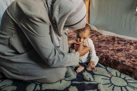 가자지구 샴스(Shams) 캠프에서 국제구조위원회가 제공한 영양실조 치료식(RUFT)을 10개월 된 자녀에게 먹이고 있는 어머니의 모습. 국제구조위원회 |