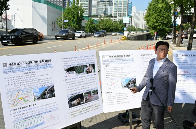 한병용 서울시 재난안전실장은 29일 서울 중구 서소문고가차도 앞에서 철거공사 현장 설명회를 열고 "교각 받침부의 구조적 안전성과 보의 내외부 강선 파손은 단순 보수공사만으로는 안전성 확보가 불가능하다"며 "콘크리트 낙하 사고가 반복적으로 발생해 시민 안전을 위협하고 있어 조속한 철거가 필요하다"고 말했다.
