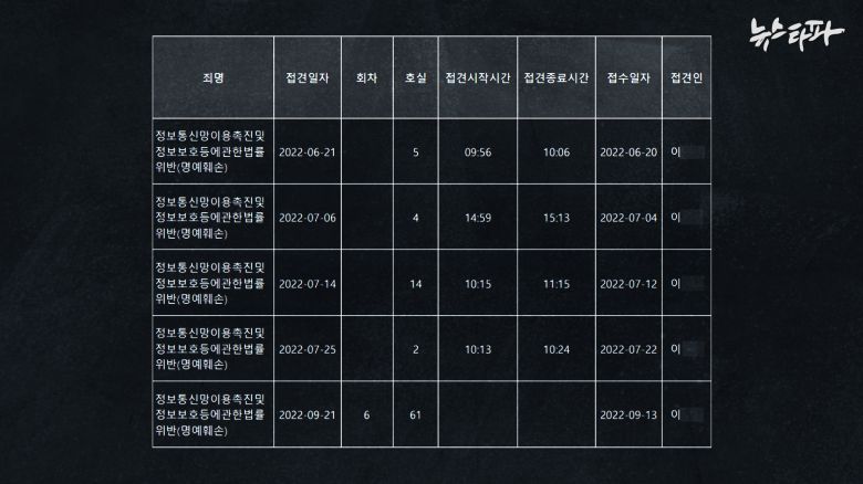 지난 2022년 6~9월 윤상현 국민의힘 의원의 측근 이모 변호사가 이 씨를 접견한 기록.