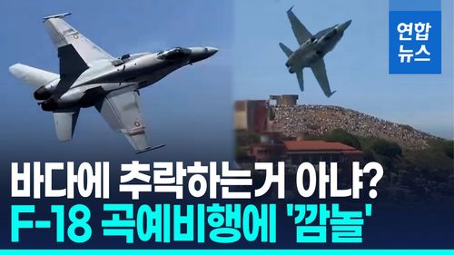 (서울=연합뉴스) 스페인에서 열린 한 에어쇼에서 전투기가 새 떼를 피해서 회피기동 하는 아찔한 모습이 포착됐습니다.