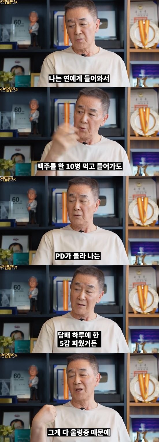 그는 "예전에는 하루에 담배를 다섯 갑 피웠다. 컷 한 번 할 때마다 한 대씩 피웠다"며 "DJ로 음악 프로그램 진행할 때 잔기침이 너무 심해 진행하기 어려웠다"고 당시 상황을 회상했다.
