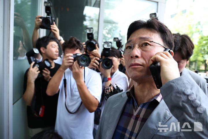 [서울=뉴시스] 최진석 기자 = 임성근 전 해병대 1사단장이 29일 오전 서울 서초구 이명현 순직 해병 특별검사 사무실에서 '신속한 결정 요청서' 제출 위해 대기하며 전화를 하고 있다. 2025.07.29. myjs@newsis.com